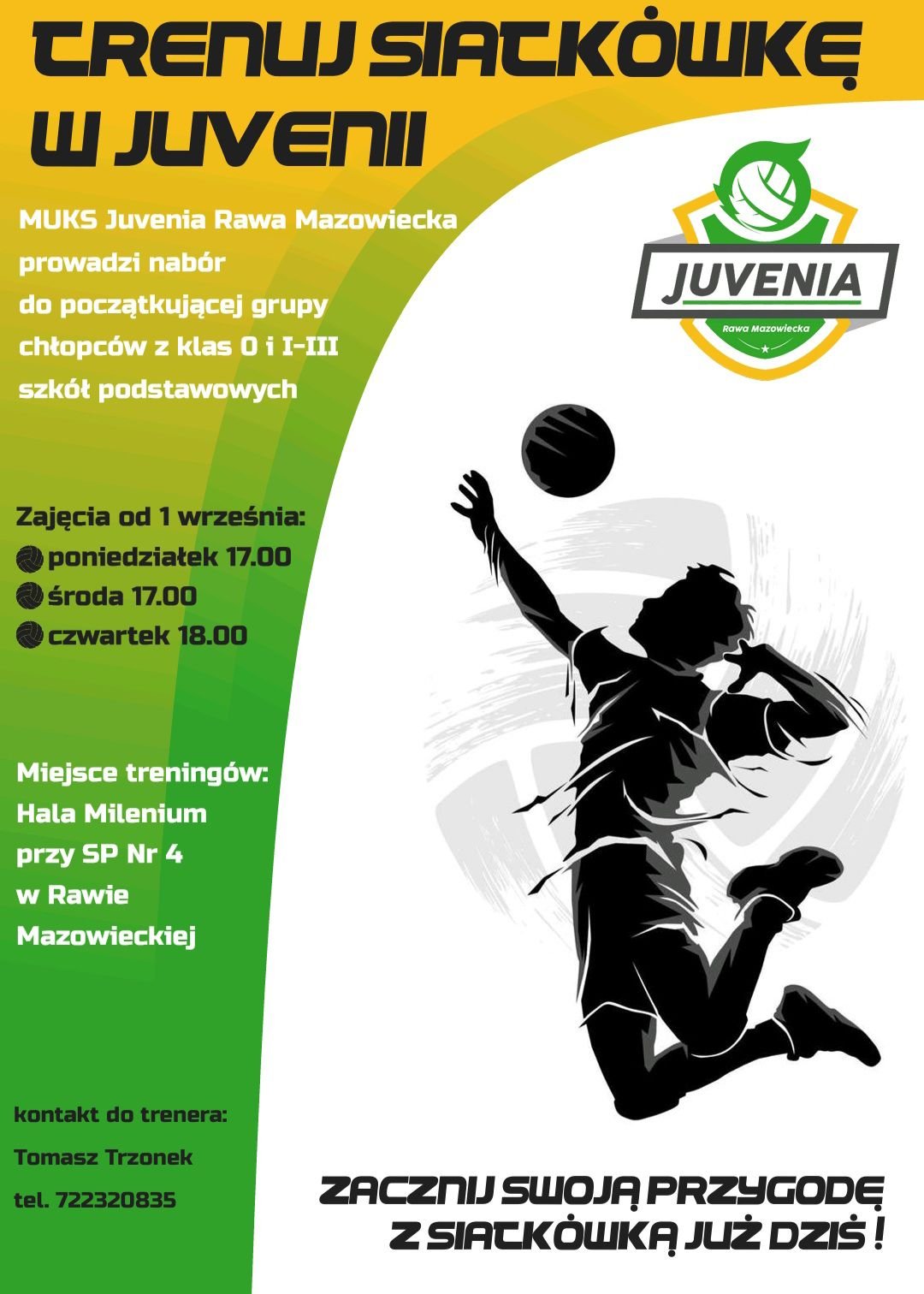 MLUKS Juvenia Rawa Mazowiecka zaprasza chłopców na treningi siatkówki w grupie początkującej.